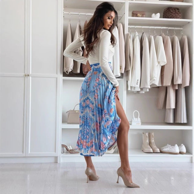 Ladies Midi Skirt – High Waist – A-Line Pleated – Soft Fabric – Print with Slit