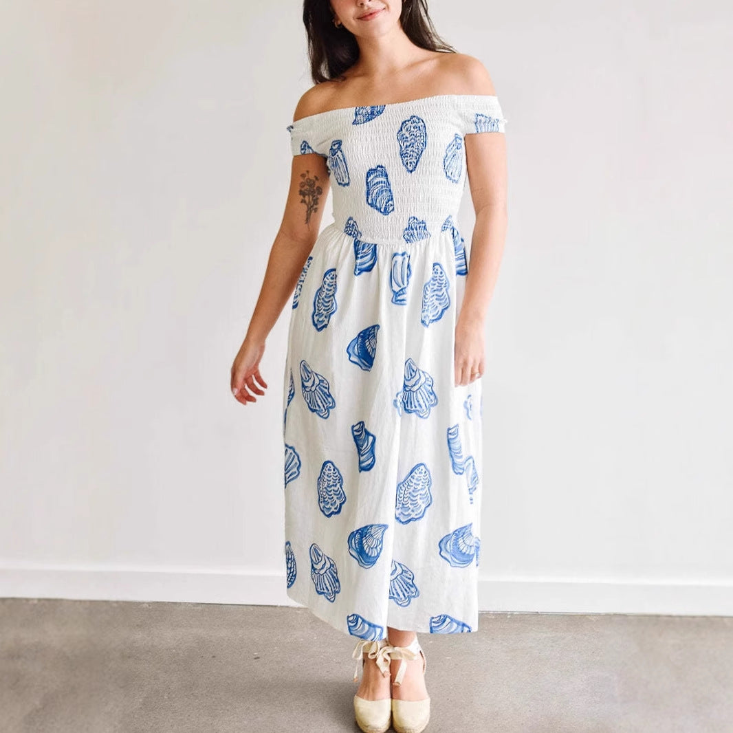Women's Off-Shoulder Dress – A-Line – Smocked Top – Breathable – Shell Print – Midi-Length