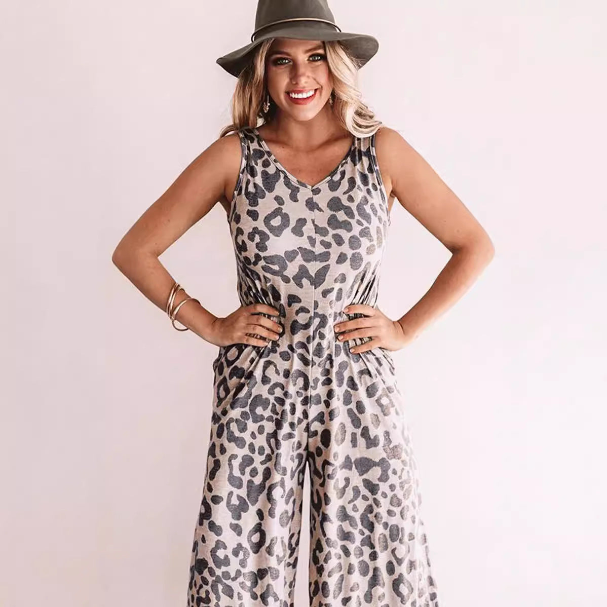 Ladies jumpsuit – Sleeveless – Leopard print – V-neck – Loose fit – Cropped wide model