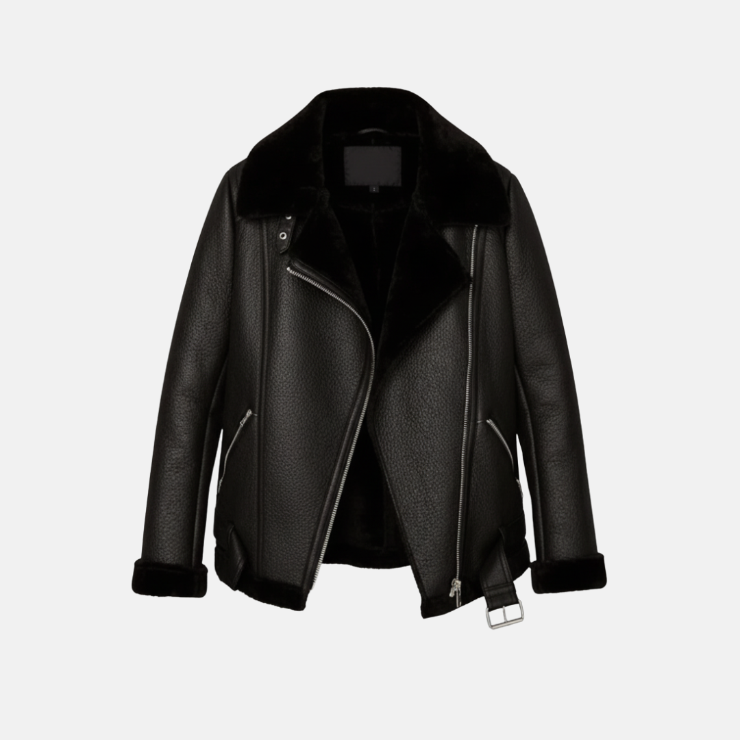 Women's Motorcycle Jacket – Loose Fit – Faux Leather – Shearling Lining – Belt Closure