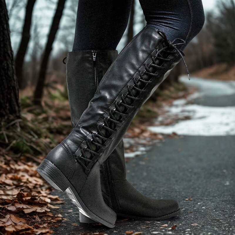 Ladies Knee-High Boots – Faux Leather – Criss-Cross Lacing – Low Block Heel – Side Zip