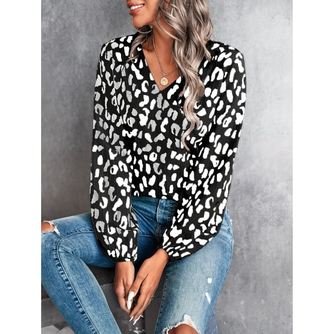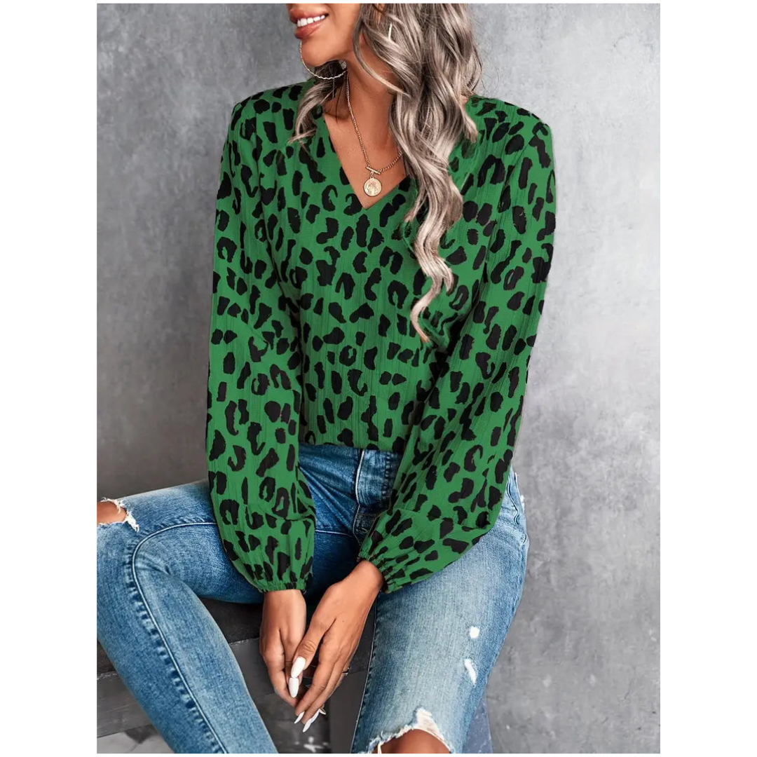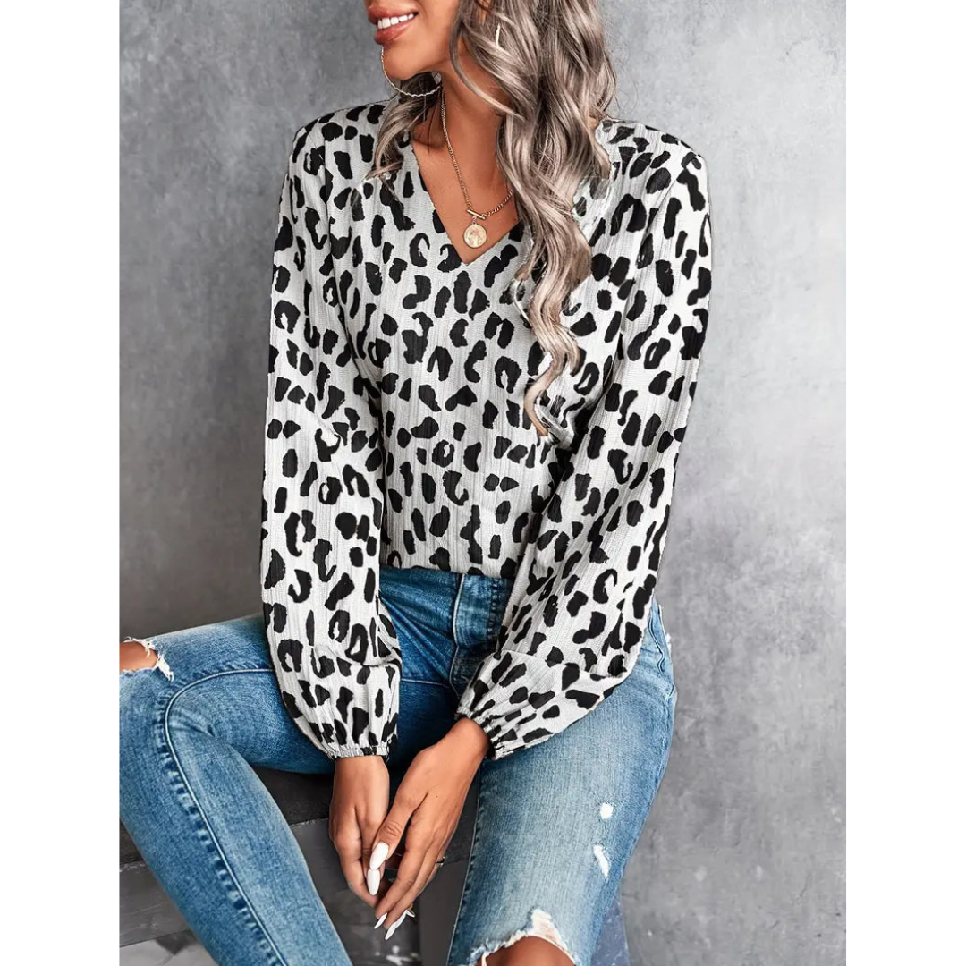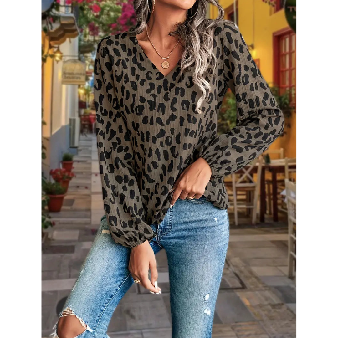 This women's blouse with a V-neck and leopard print offers a bold and fashionable look, perfect for both casual and more dressed-up occasions. The leopard pattern adds a playful and daring flair, while the V-neck gives an elegant, feminine touch.