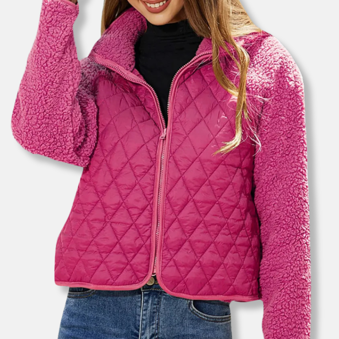 - Design: Cropped relaxed fit with a padded body and contrasting fluffy sherpa sleeves, featuring a stand-up collar and zipper closure.