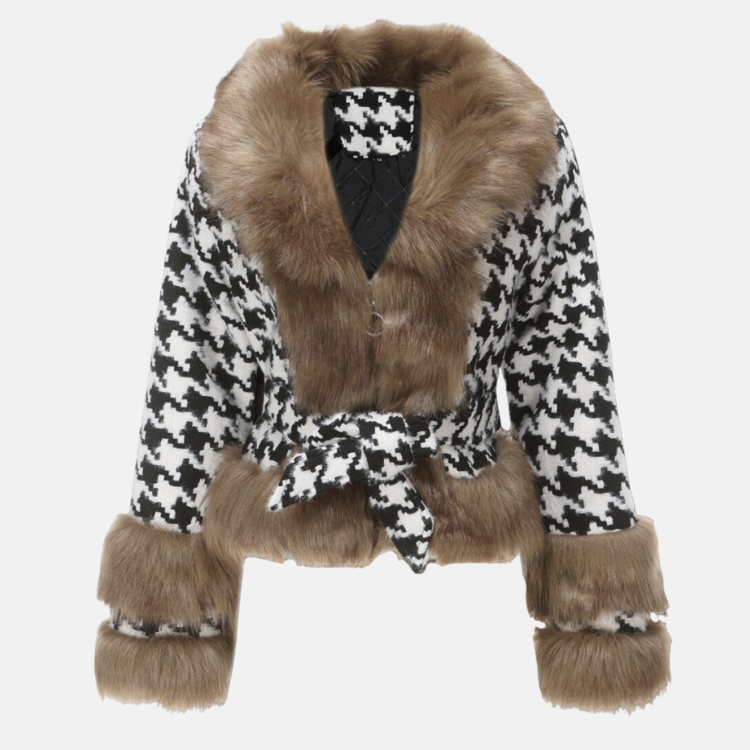 Women's Short Coat – Houndstooth Design – Plush Fur Collar – Fitted with Belt