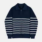 This blue-and-white quarter-zip sweater combines sporty style with comfortable functionality. The fresh color palette provides an energetic appearance, while the quarter-zip closure makes it possible to adjust the sweater to your preference. Perfect for a casual day or a relaxed weekend outfit.