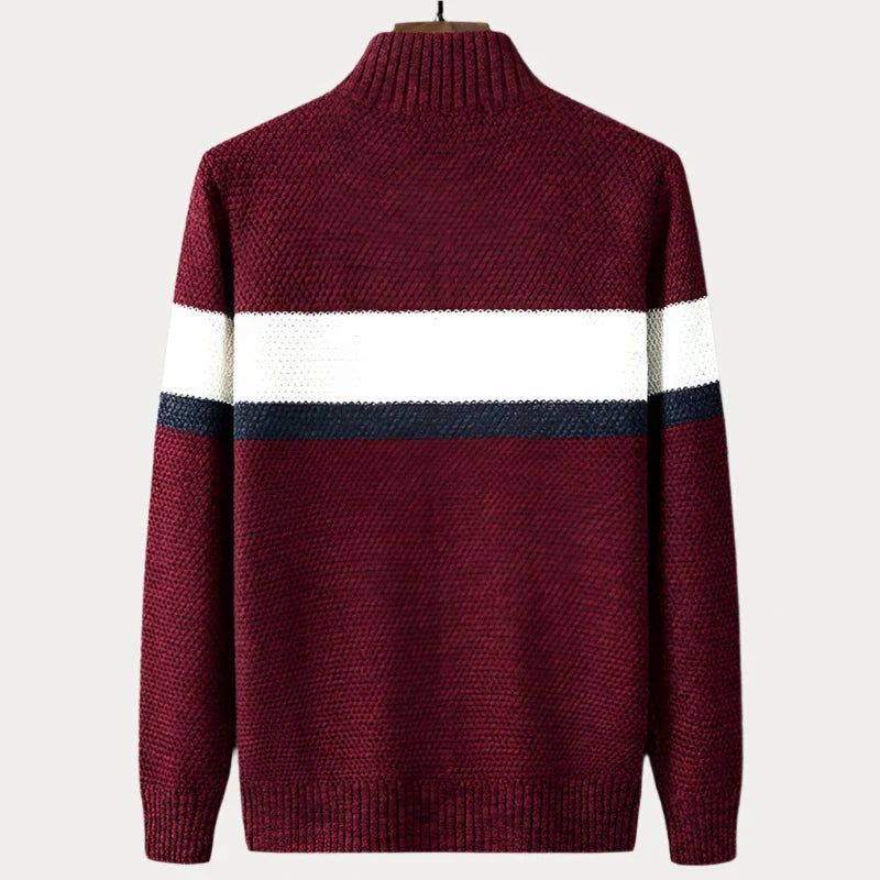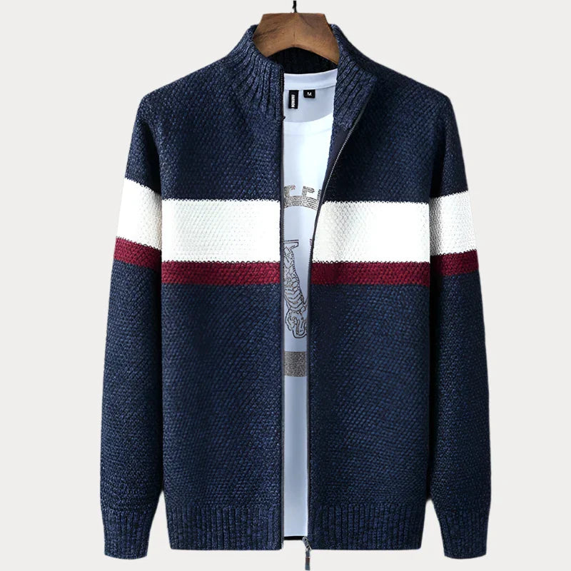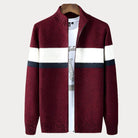This striped cardigan for men features a stand-up collar, perfect for added comfort and style. The design offers a modern look, ideal for casual occasions.