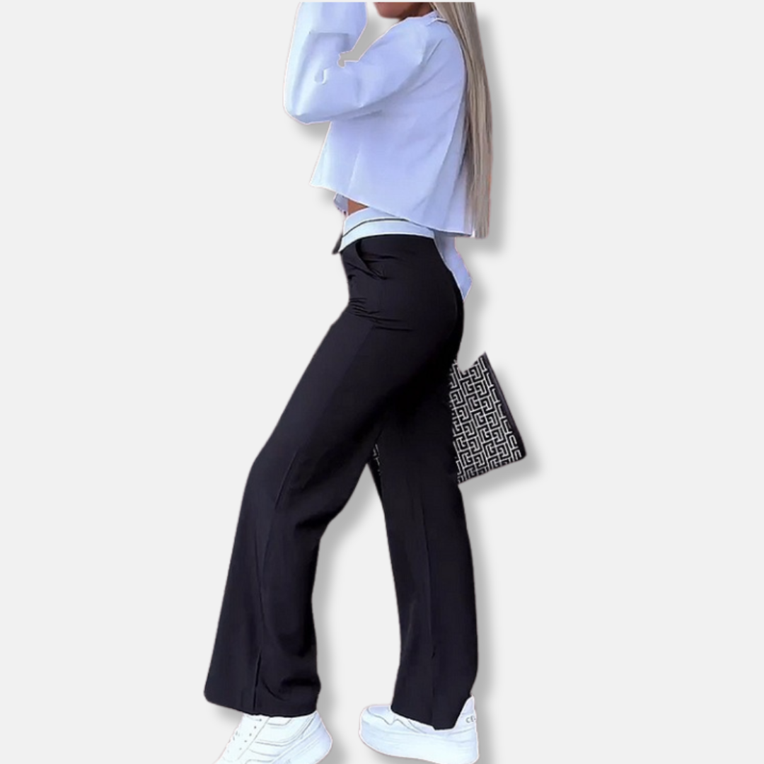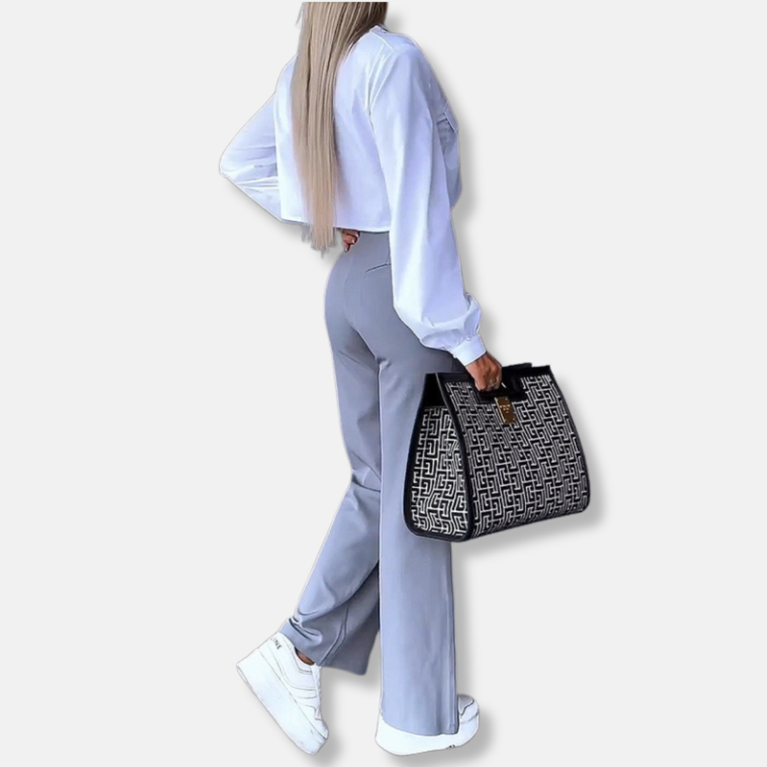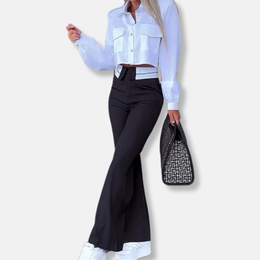 Ladies' Two-Piece Set – Cropped Shirt with Collar – Flared High-Waist Pants