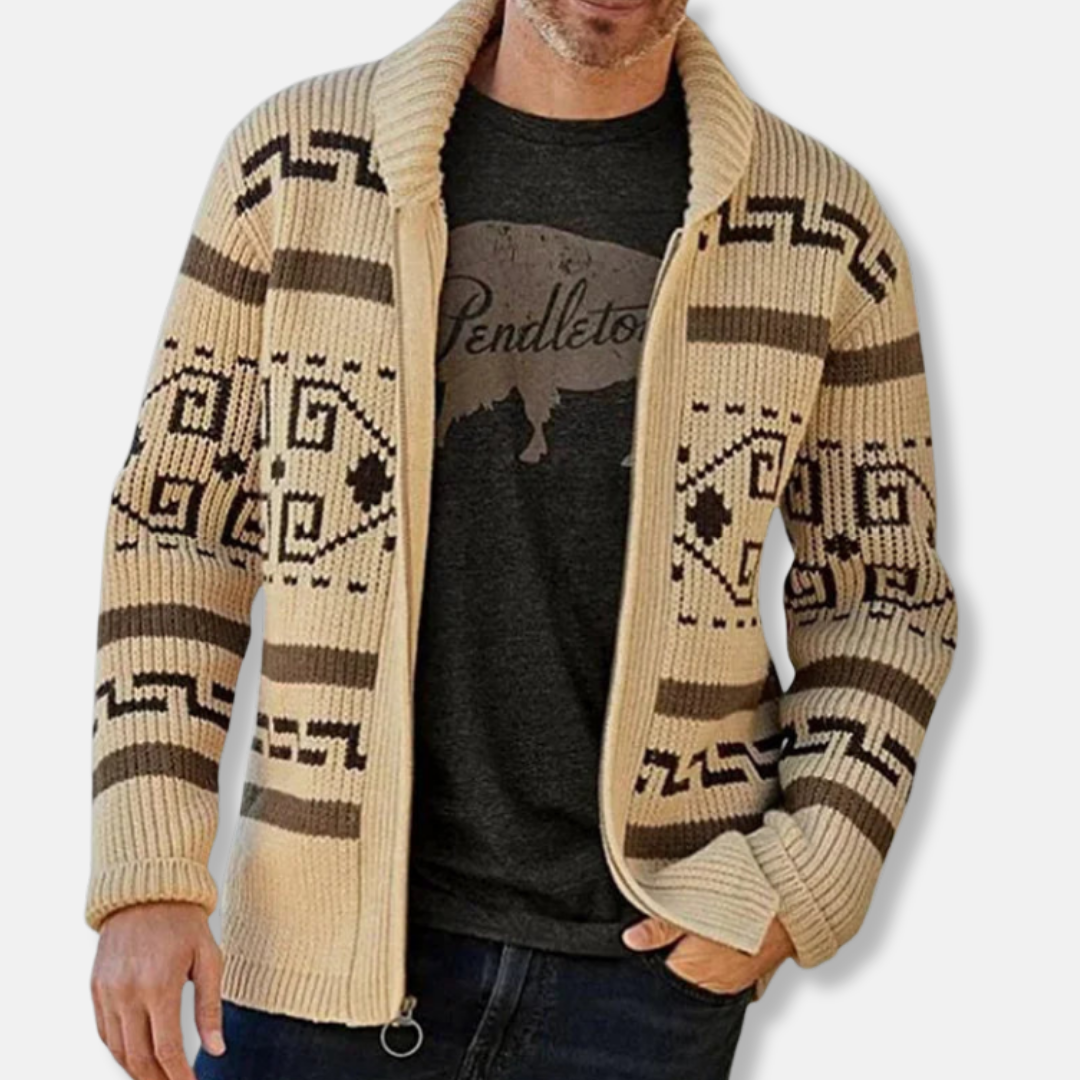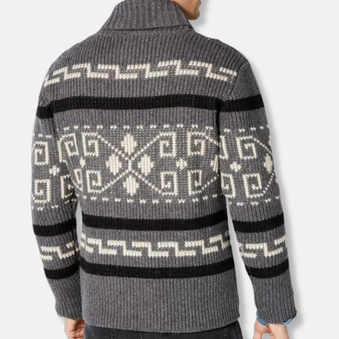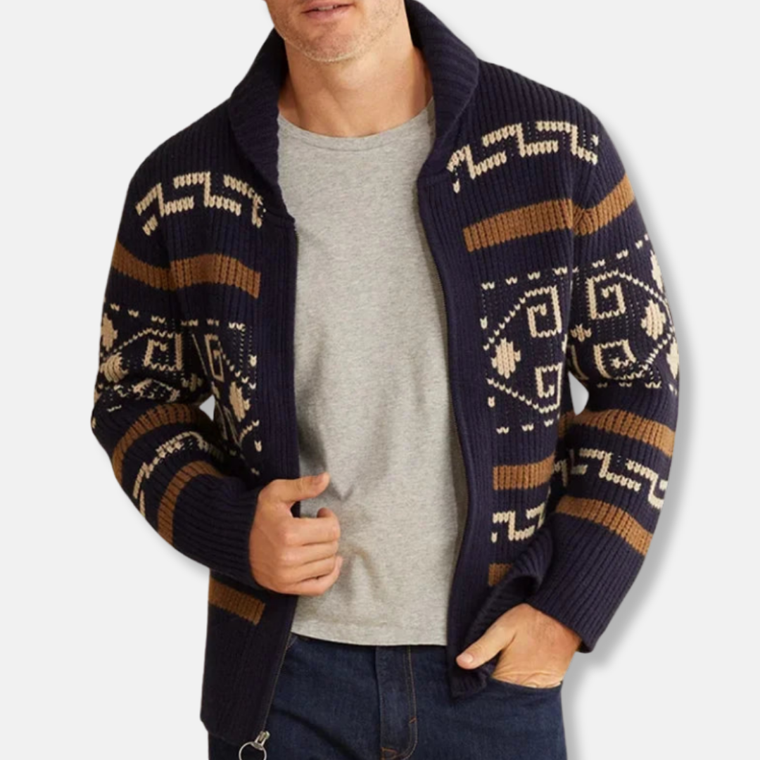 Men's Cardigan – Slim Fit – Wool Mix – Zipper Closure – Shawl Collar – Geometric Pattern
