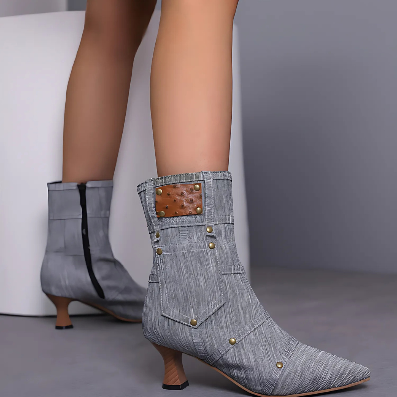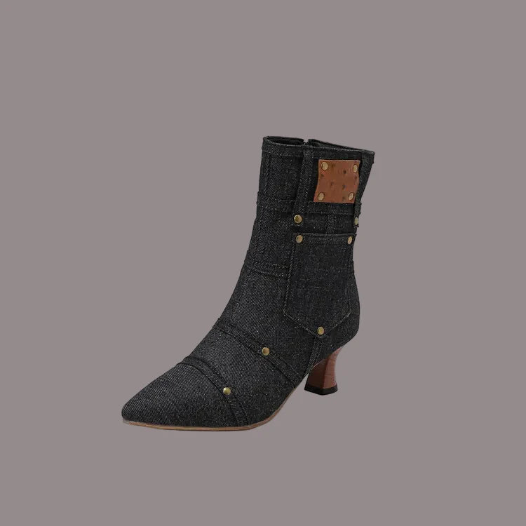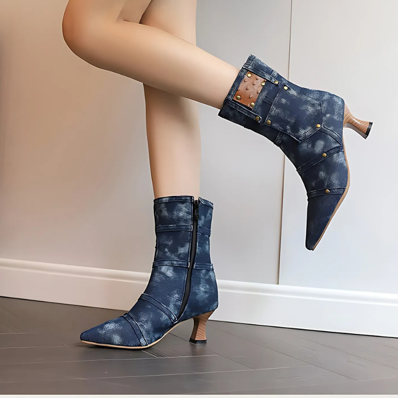 Women's Ankle Boots – Slim Fit Pointed Toe – High Stiletto Heel – Denim Look with Studs