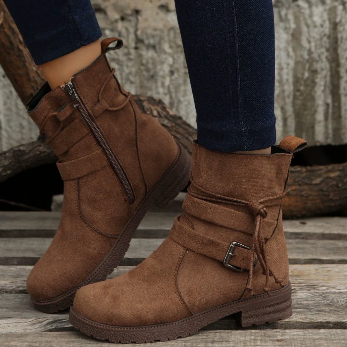 Women's Ankle Boots – Suede Look – Round Toe – Low Heel – Buckle with Tassels