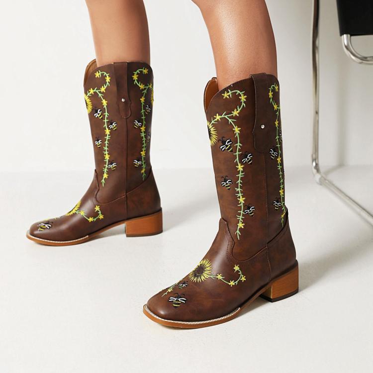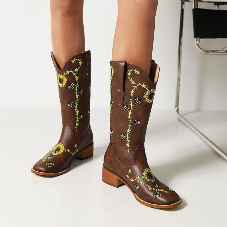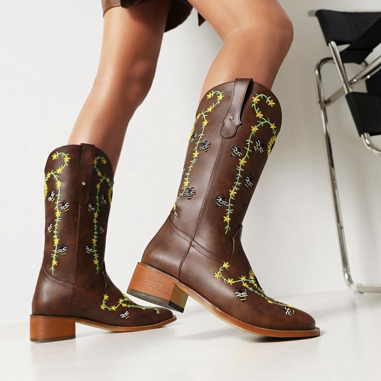 Women's Knee-High boots – Leather – Embroidered Detail – Square Toe – Block Heel