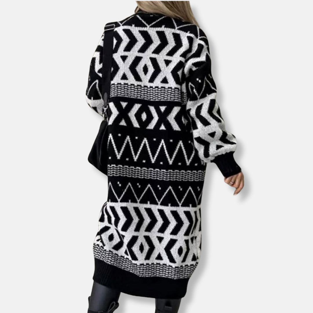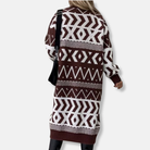 Women's Long Cardigan – Loose Fit – Jacquard Knit – Geometric Pattern – Open Front