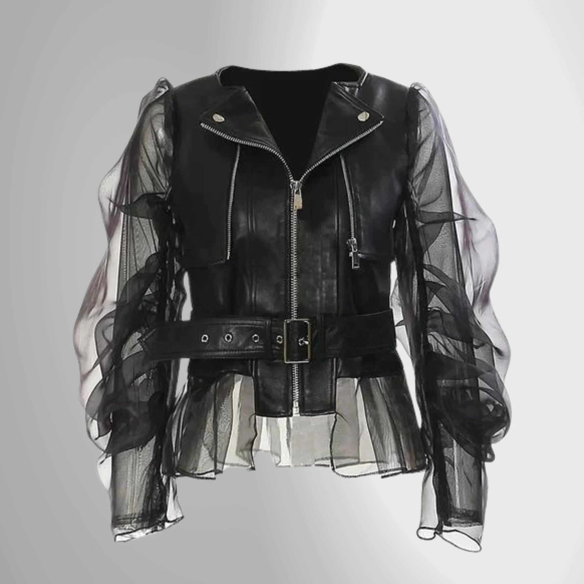 Women's leather jacket – Fitted model – Transparent puff sleeves – Belt – Zipper