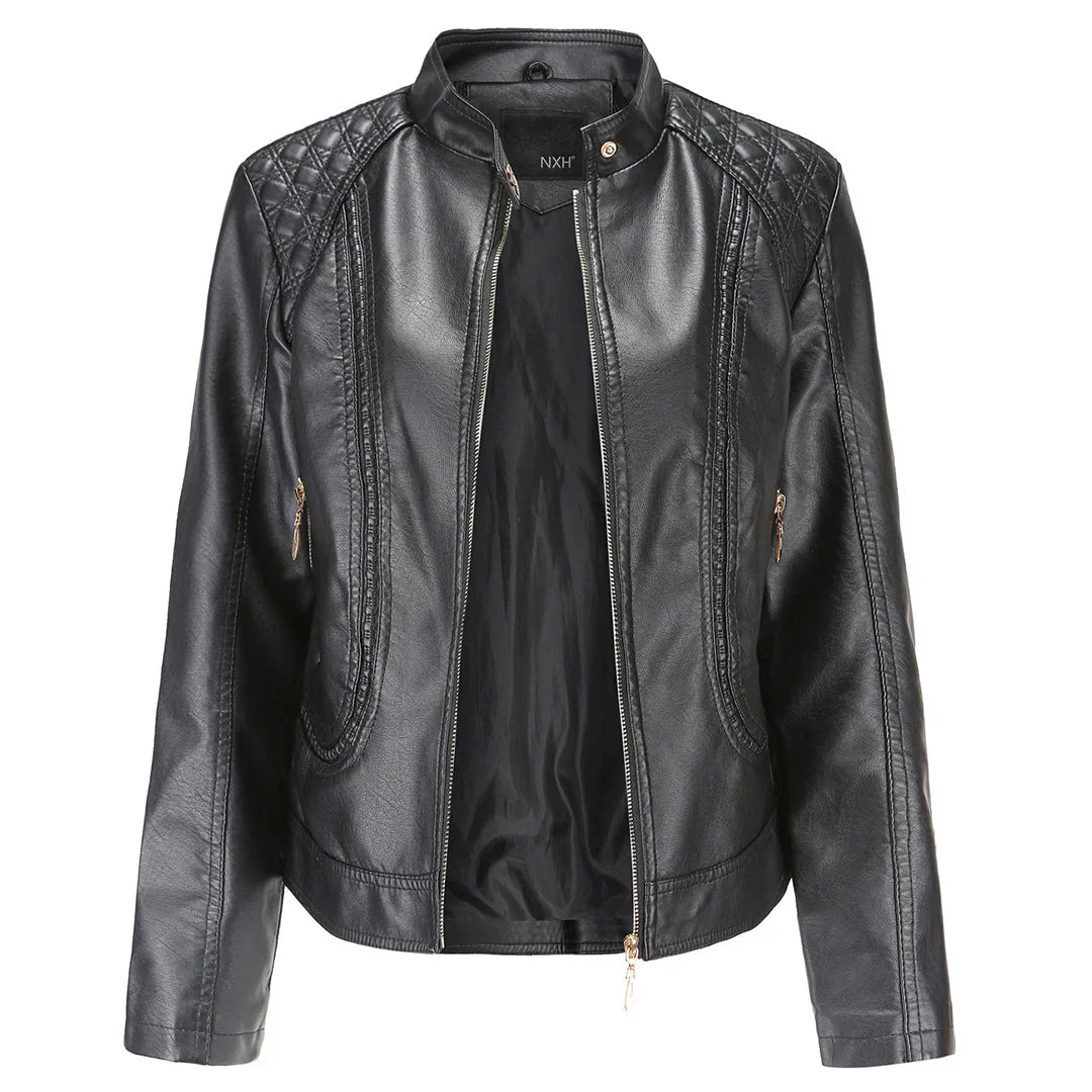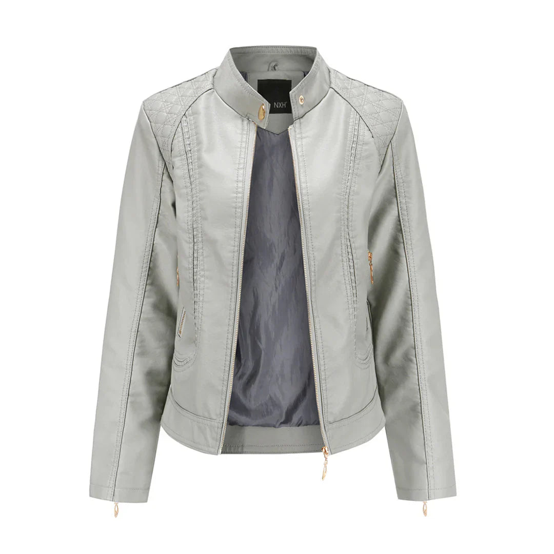 Women's Leather Jacket – Slim Fit – Padded Shoulders – Stand-Up Collar – Zip Pockets