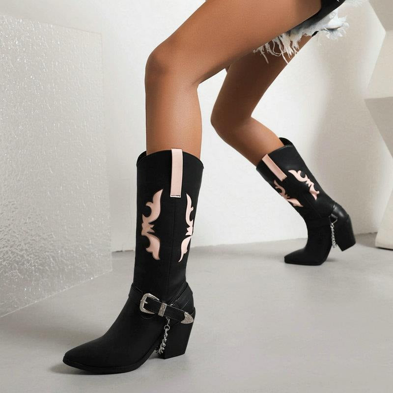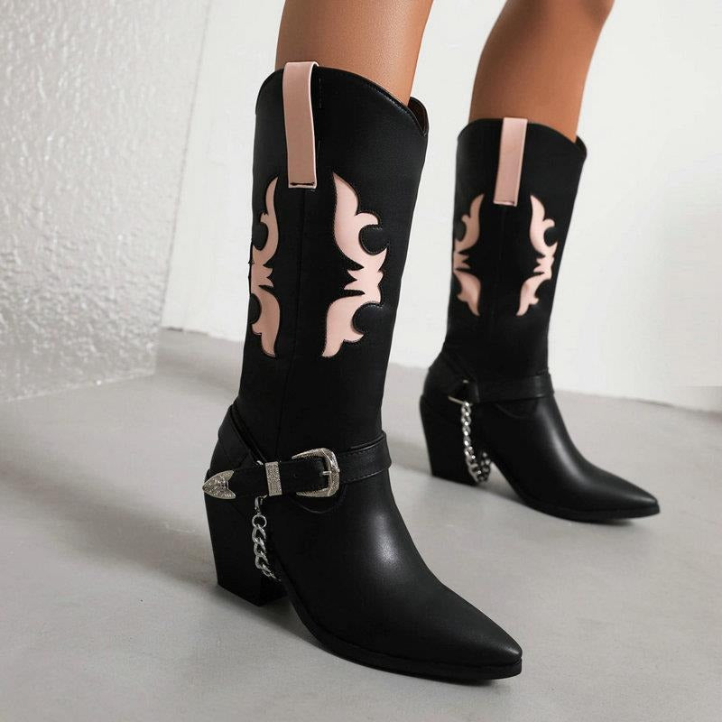 Ladies Mid-Calf Boots – Leather-Look – Pointed Toe – Block Heel – Embroidered Strap – Chain
