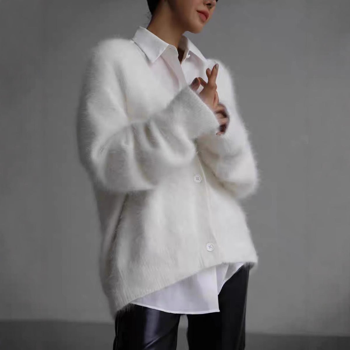 Women's cardigan – Oversized fit – Fuzzy knit – V-neck with buttons – Long sleeve