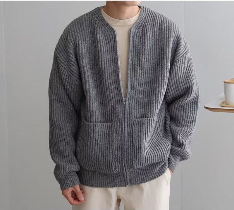 Men's cardigan jacket – knitted wool – oversized fit – ribbed texture – zip fastening