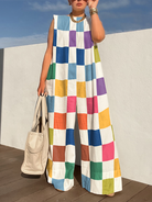 This sleeveless multicolored jumpsuit for women features a lively design that is both stylish and comfortable. It is an ideal choice for warmer weather and adds a playful yet chic touch to your outfit.