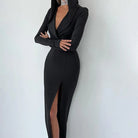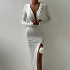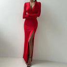 Ladies Evening Dress - Long Fitted Cut - Deep V-Neck - Slit - Elegant Style