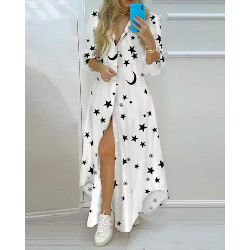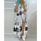 A vibrant, multi-pattern long dress that offers a bold look. The combination of striking prints and the flowing silhouette creates a unique, fashionable look that is perfect for any occasion.