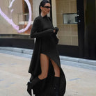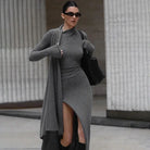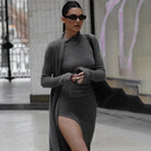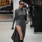 A refined dress with a stylish slit, designed to combine elegance with a modern look. The sleek silhouette and the distinctive detail make it suitable for a variety of occasions.