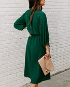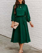 Women's Dress - Midi Length - Round Neck - Long Sleeves - Waist Belt - Relaxed Fit