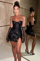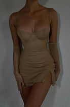 Women's Mini Dress – Bodycon Fit – Sweetheart Neckline – Shiny Finish – With Long Gloves. Shine and sparkle in this bodycon mini dress with a sweetheart neckline and a shiny finish. Perfect for a night out, the dress comes with elegant long gloves for a complete look.