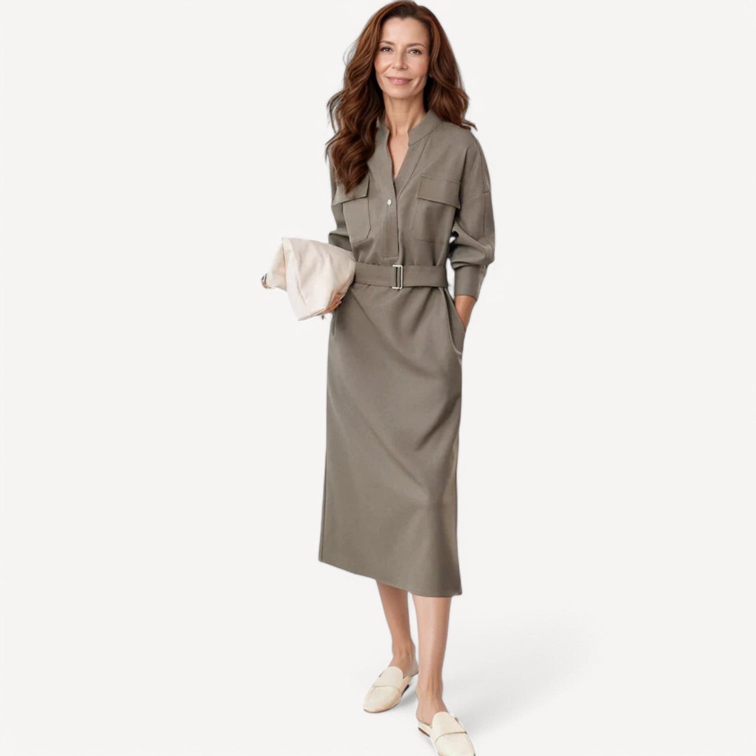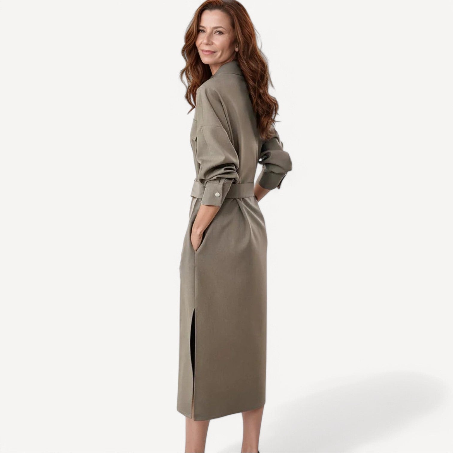 Shirt dress with belt for women – a stylish midi dress with a sleek fit and refined details.