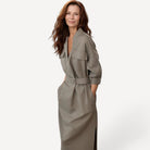 The dress falls below the knee and is finished with a side slit for extra freedom of movement. The long sleeves and adjustable waist tie provide a classic appearance with room for personal styling. Pair with loafers or ankle boots for a casual chic look, or wear it under a trench coat on colder days.