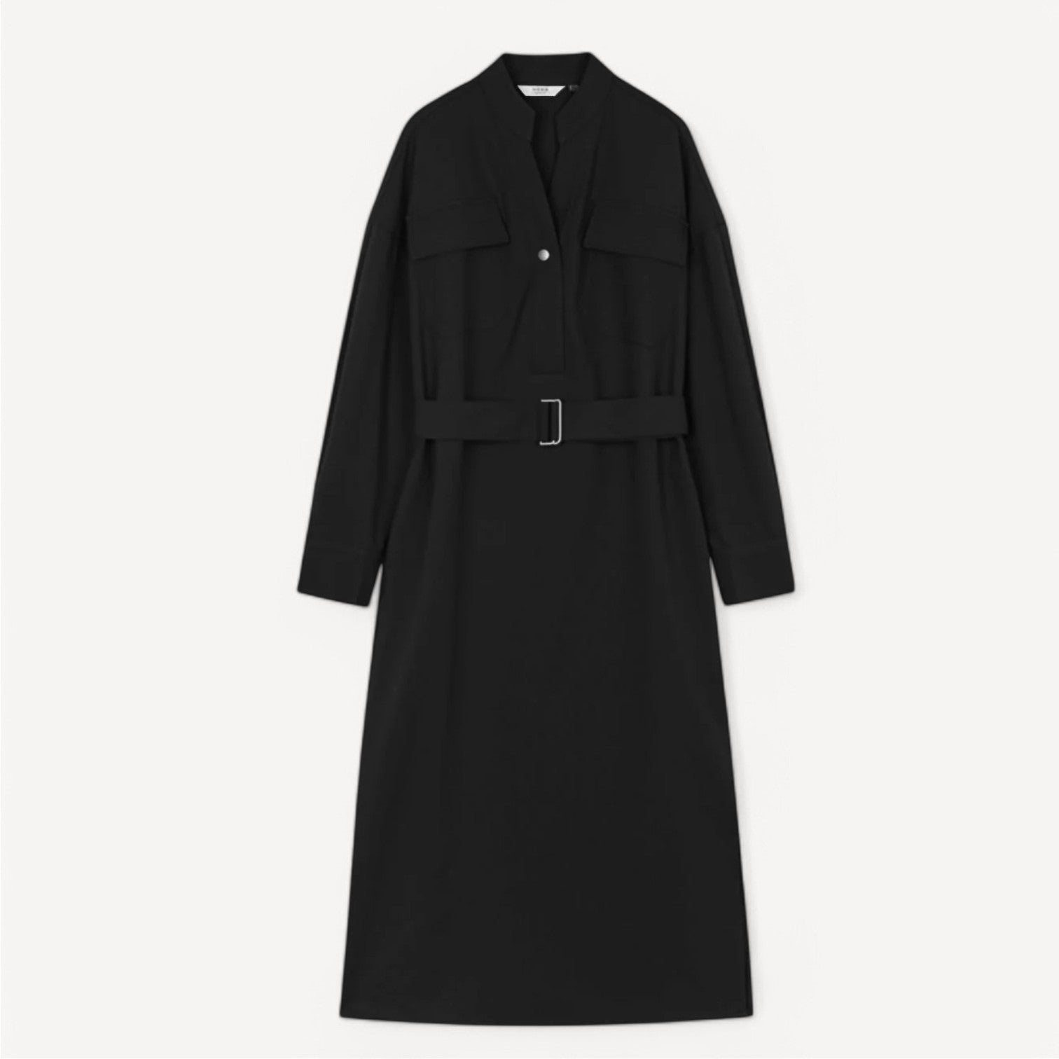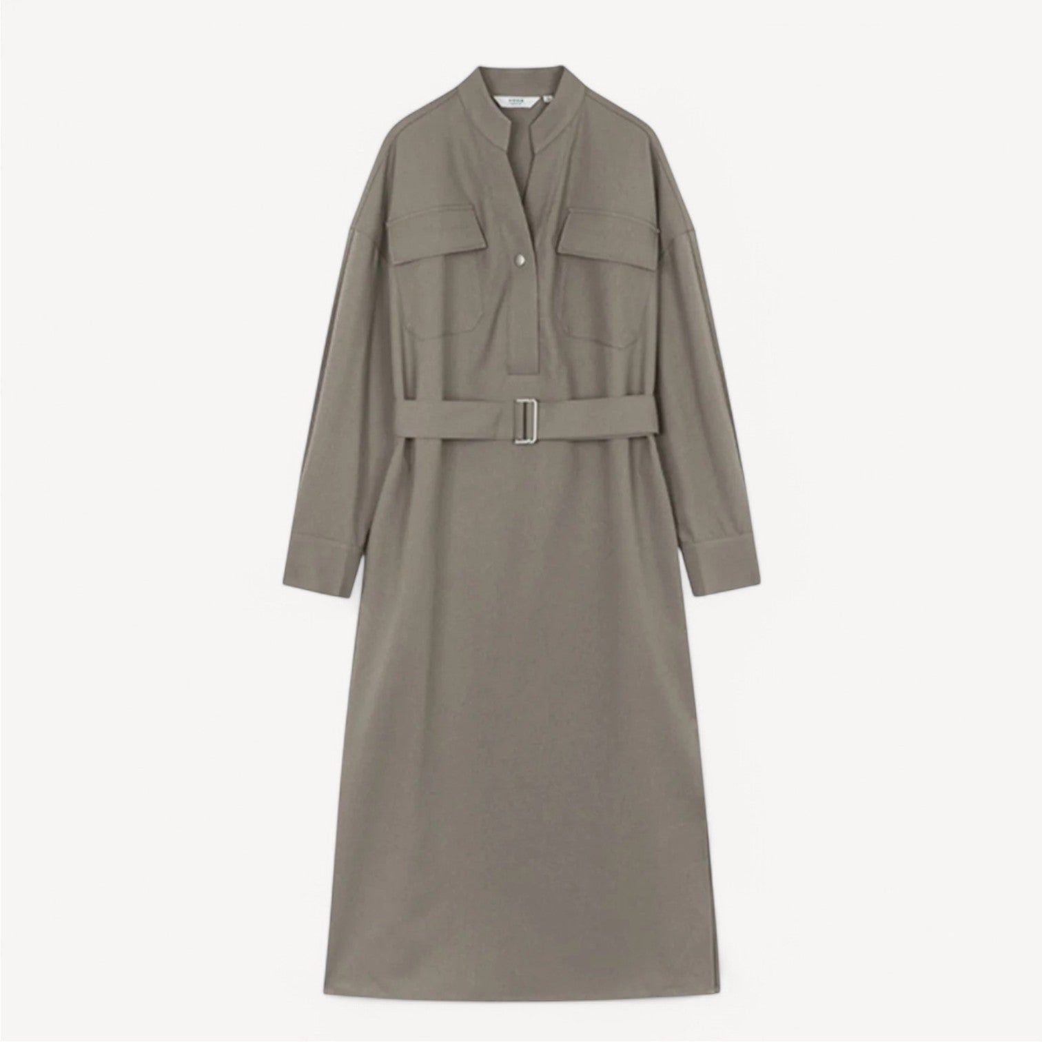 The Jules shirt dress with belt is made in a structured woven fabric with a soft touch. This midi dress has a straight silhouette, a belt at the waist and two flap pockets on the chest for a modern utility look. The collarless neckline and neutral colors – Khaki and Black – make this a versatile item for everyday wear or business occasions.