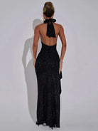 This elegant maxi dress with a daring backless slit exudes pure refinement and allure. The flowing silhouette and the open back make this dress perfect for an evening out.