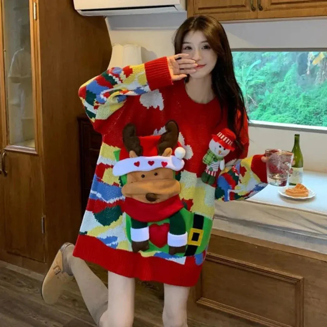 Make an impression during the holidays with this women's 3D oversized Christmas sweater. The unique 3D design adds a playful and eye-catching touch, while the oversized fit provides ultimate comfort. Perfect for Christmas parties or cozy moments at home, this sweater combines festive cheer with a trendy style.