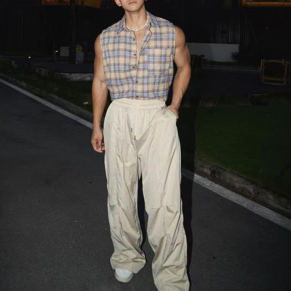 - Design: Sleeveless, checkered pattern, button closure, chest pocket, loose fit