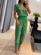 Women's Two-Piece Set - V-Neck Top - Short Sleeve - High Waist Jogger Pants - Loose Fit