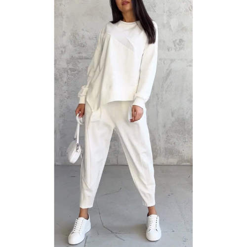 This two-piece set with a round neck and long sleeves combines a simple style with a comfortable fit. The set consists of a minimalist top and matching pants, ideal for both casual days at home and informal outings.