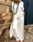 Ladies Set - Flowy Blouse with V-neck - High Waist Wide Leg Pants - Airy Fabric