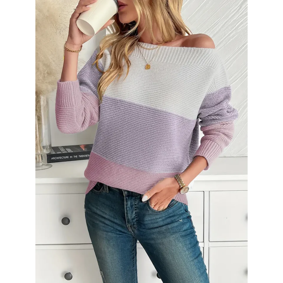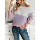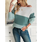 Women's Sweater - Knitted - Off Shoulder - Color Blocks - Long Sleeves - Relaxed Fit