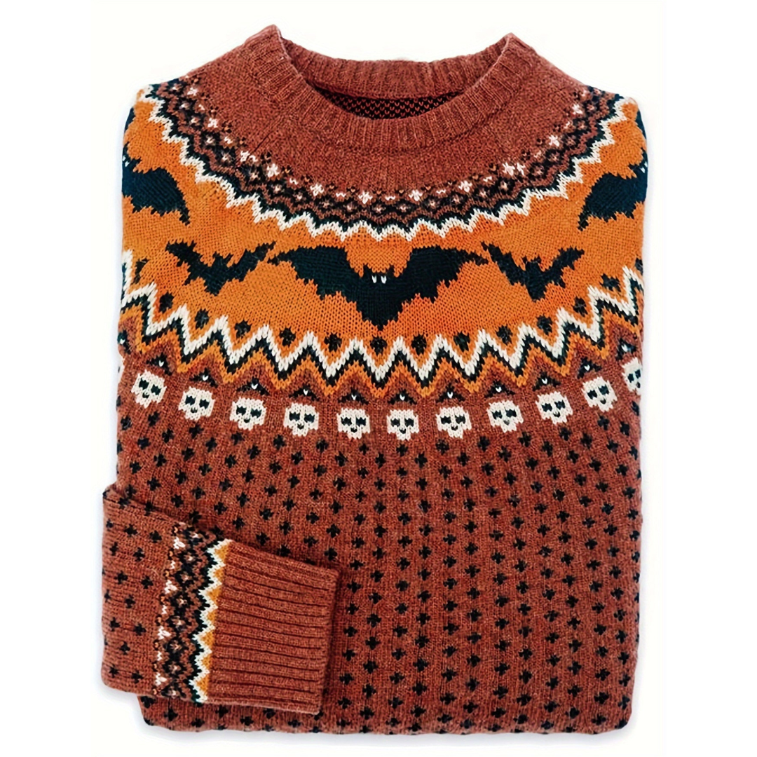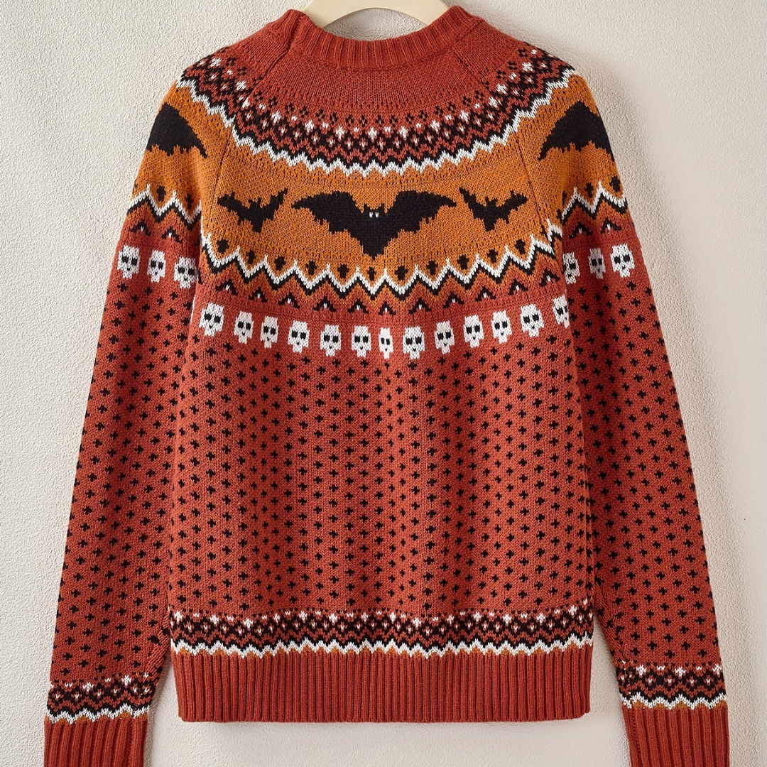 This women's winter sweater with long sleeves and a round neck has a playful appearance thanks to the unique bat print that adorns the design. Perfect for anyone who wants to add a bit more character to her winter wardrobe, this sweater offers both warmth and a cheerful look. The playful print makes it a standout item for your casual outfits.