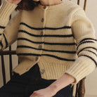 This striped knitted cardigan for women offers a stylish and casual look with a playful twist. The striped pattern adds visual interest, while the comfortable fit provides a relaxed and fashionable appearance, perfect for everyday wear.