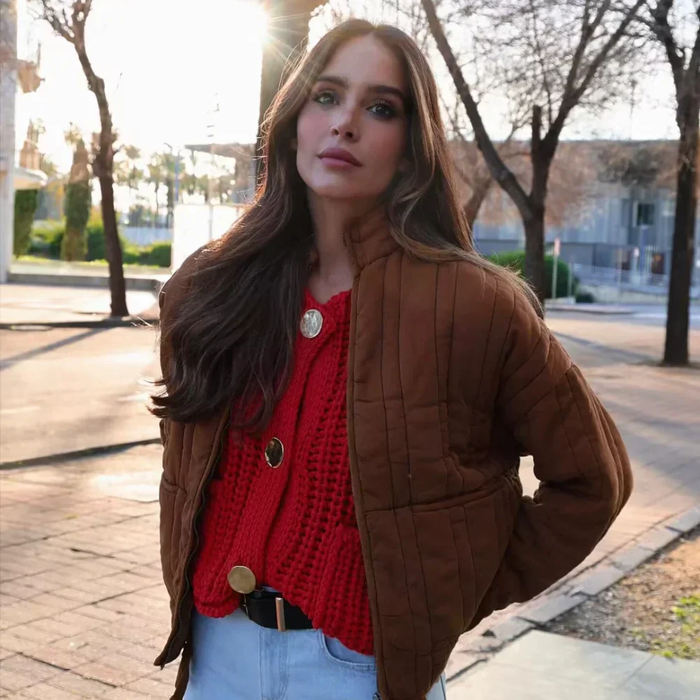 This sleeveless vest in a casual knitted style offers a relaxed and stylish look, perfect for layering on cooler days. The design provides extra warmth while offering a fashionable finish, ideal for both casual and sporty outfits.