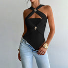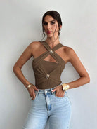 Wear this versatile halter top with high-waisted jeans for an effortlessly casual-chic look. For a night out, pair it with an elegant skirt and accessories to let the metallic details shine.