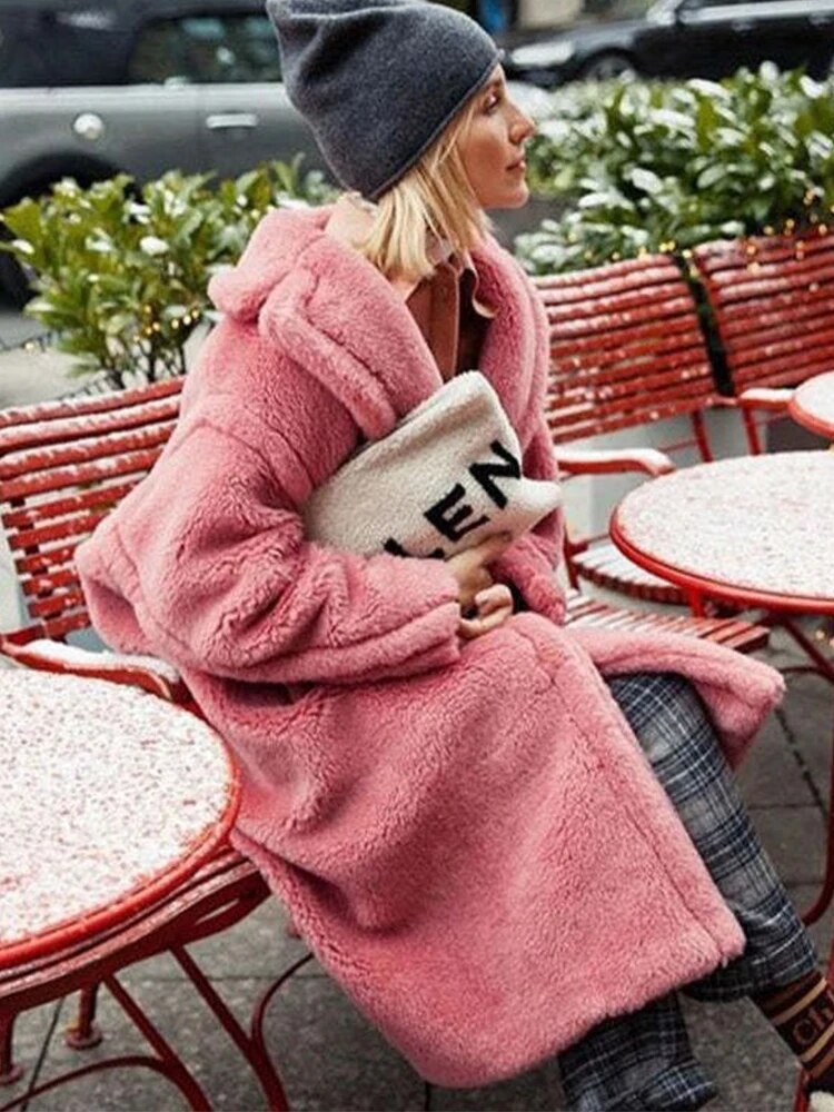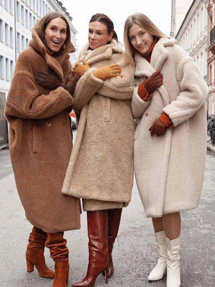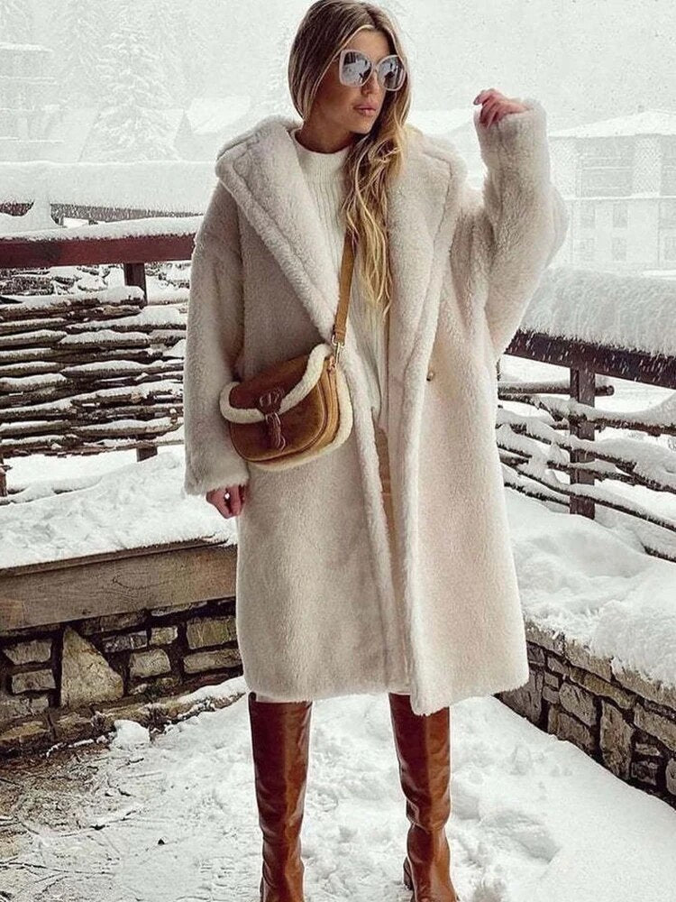 Women's Long Teddy Coat - Oversized Fit - Soft Texture - Large Lapel Collar