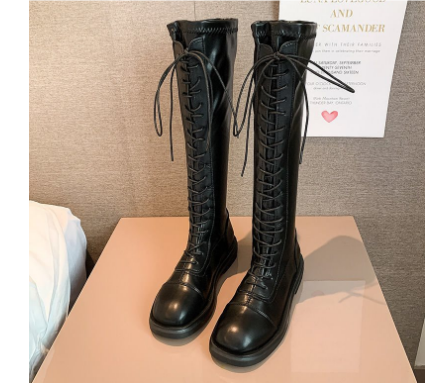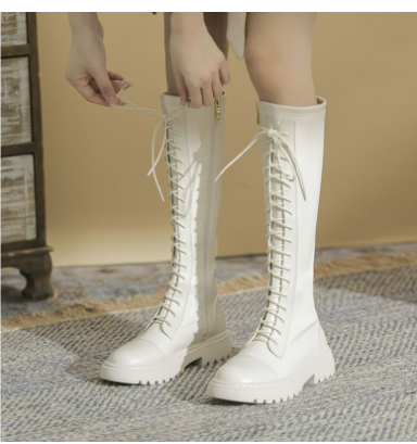 Women's Knee-High Lace-Up Shoes - Chunky Sole - Synthetic Leather - Fashionable Fit