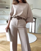 This blouse and pants with long sleeves for women provide a stylish and comfortable appearance. The design is ideal for a chic casual look or a more formal occasion.