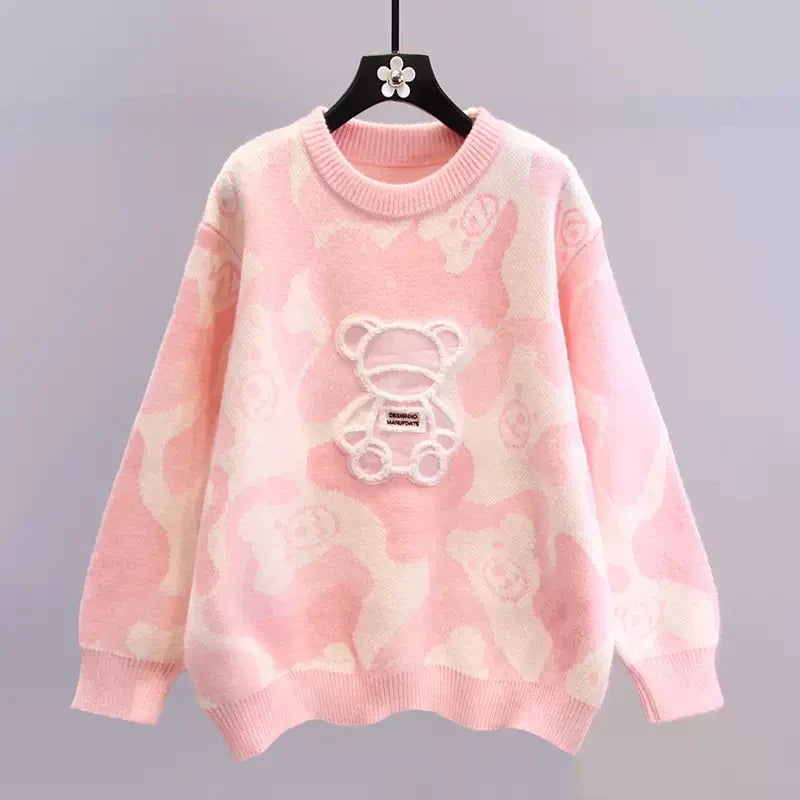 This sweater features a bear design that combines a playful appearance with a simple, stylish cut. It offers a comfortable and relaxed fit, ideal for various casual occasions.