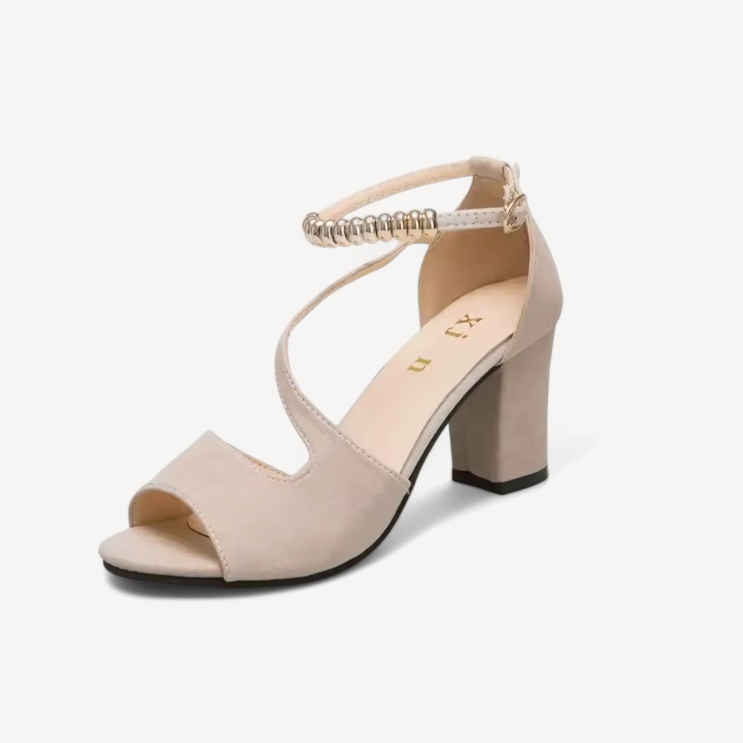 These Jules heeled sandals combine an open toe and a crossed strap structure with a sturdy block heel. The adjustable ankle strap is finished with a distinctive metallic detail for a refined touch. Thanks to the suede-look finish and neutral colors, these sandals are a versatile addition to your shoe collection.