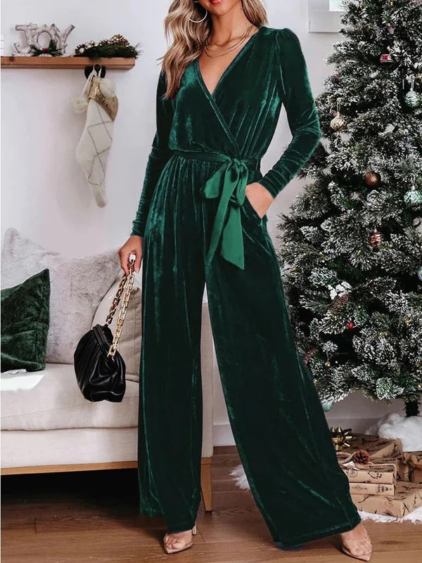 Women's jumpsuit – Fitted model – Velvet – V-neck – Long sleeve – Wide leg