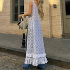 Women's Lace Dress – A-Line Fit – V-Neck – Tie-Shoulder – Ruffles – Side Slit