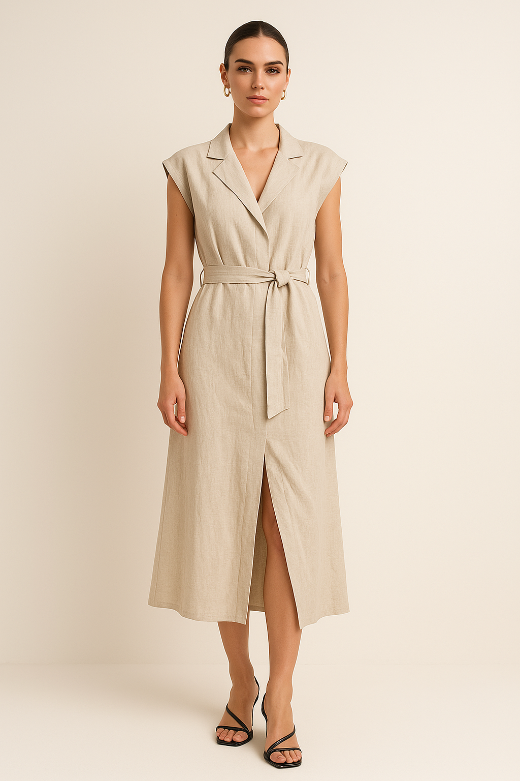 Ladies Dress – Linen Cotton – Fitted Model – Sleeveless – Belt – Front Split