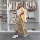 - Design: Flowy print design with elastic waist and layered look